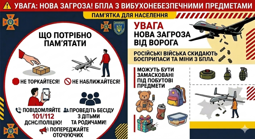 💣 БпЛА можуть скидати міни, гранати або інші боєприпаси, що залишаються небезпечними навіть після падіння. Особливо підступно — вони можуть бути замасковані або залишені в людних місцях.