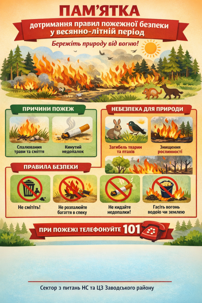 🌿 З початком настання сухої, теплої та вітрової погоди, значно підвищуються умови можливого виникнення пожеж у природних екосистемах. Пожежі найчастіше виникають через виробничу діяльність людини, а саме спалювання сміття, сухої трави поблизу лісових насаджень та територій та через необережне поводження з вогнем: недопалки, сірники, вогнища.