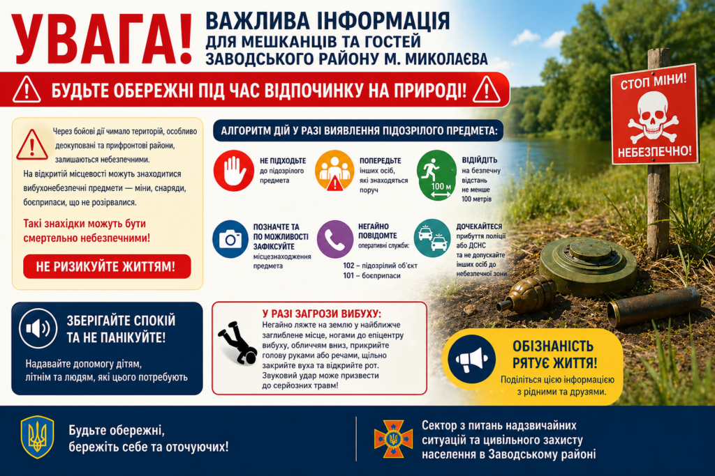 На відкритій місцевості можуть знаходитися вибухонебезпечні предмети — міни, снаряди, боєприпаси, що не розірвалися. Такі знахідки можуть бути смертельно небезпечними!