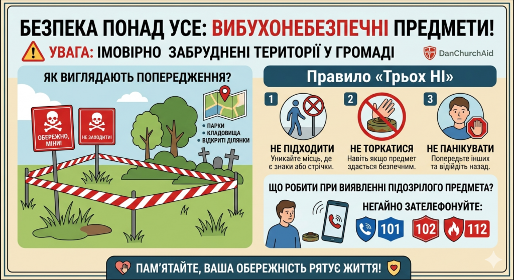 🗣 Шановні жителі міста! Повідомляємо Вам, що у ході заходів з нетехнічного обстеження оператором протимінної діяльності — Представництвом ДанЧьорчЕід в Україні — на території громади виявлено імовірно забруднені території вибухонебезпечними предметами.
